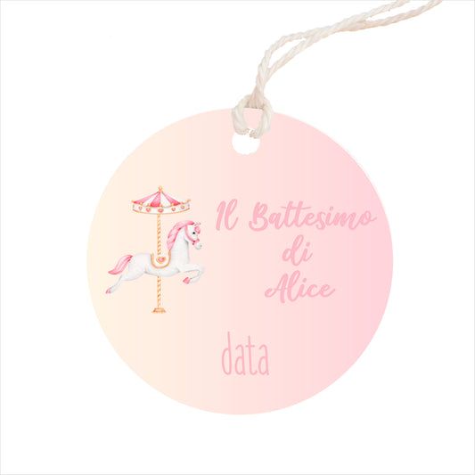 GLOBAL Bigliettini Bomboniera per Battesimo Personalizzato - CAVALLO A DONDOLO BIMBA - Bigliettini Bomboniera con piega, Bigliettini Bomboniera tondo, Personalizzati con Nome e Data, MADE IN ITALY