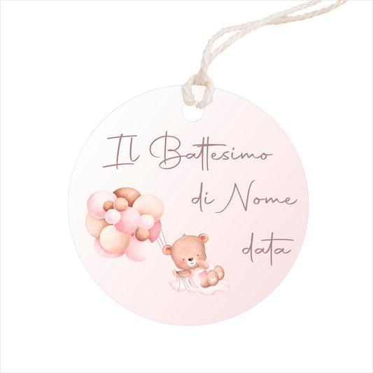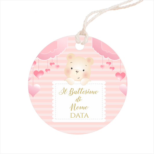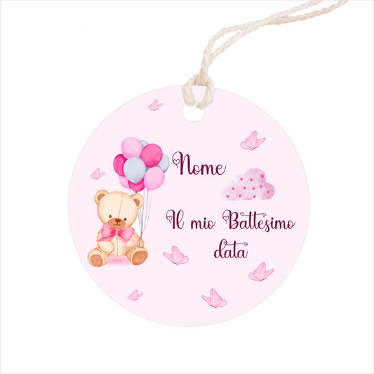 GLOBAL Bigliettini Bomboniera per Battesimo Personalizzato - ORSETTO BIMBA - Bigliettini Bomboniera con piega, Bigliettini Bomboniera tondo, Personalizzati con Nome e Data, MADE IN ITALY