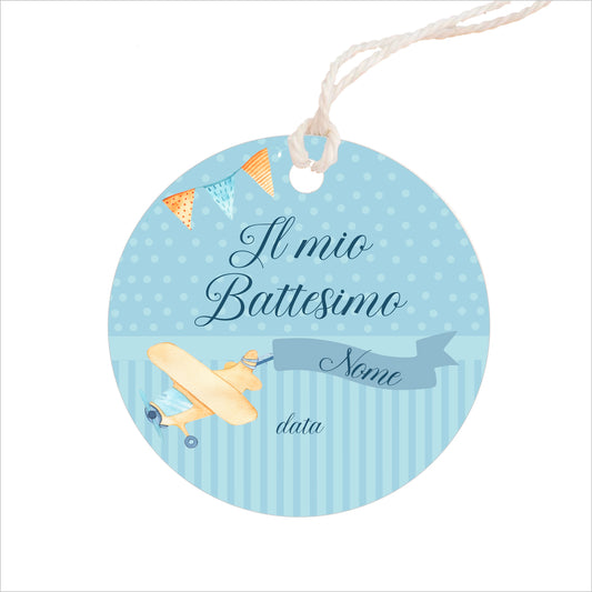 GLOBAL Bigliettini Bomboniera per Battesimo Personalizzato - AEROPLANO - Bigliettini Bomboniera con piega, Bigliettini Bomboniera tondo, Personalizzati con Nome e Data, MADE IN ITALY