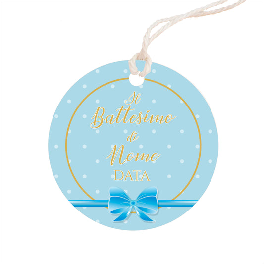 GLOBAL Bigliettini Bomboniera per Battesimo Personalizzato - FIOCCO AZZURRO - Bigliettini Bomboniera con piega, Bigliettini Bomboniera tondo, Personalizzati con Nome e Data, MADE IN ITALY