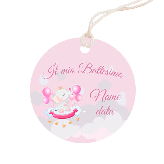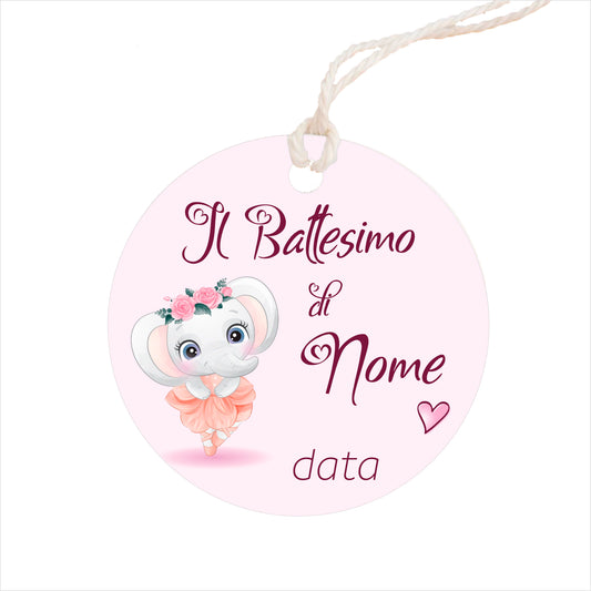 GLOBAL Bigliettini Bomboniera per Battesimo Personalizzato - ELEFANTE BALLERINA - Bigliettini Bomboniera con piega, Bigliettini Bomboniera tondo, Personalizzati con Nome e Data, MADE IN ITALY