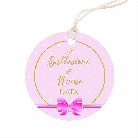 GLOBAL Bigliettini Bomboniera per Battesimo Personalizzato - FIOCCO ROSA - Bigliettini Bomboniera con piega, Bigliettini Bomboniera tondo, Personalizzati con Nome e Data, MADE IN ITALY