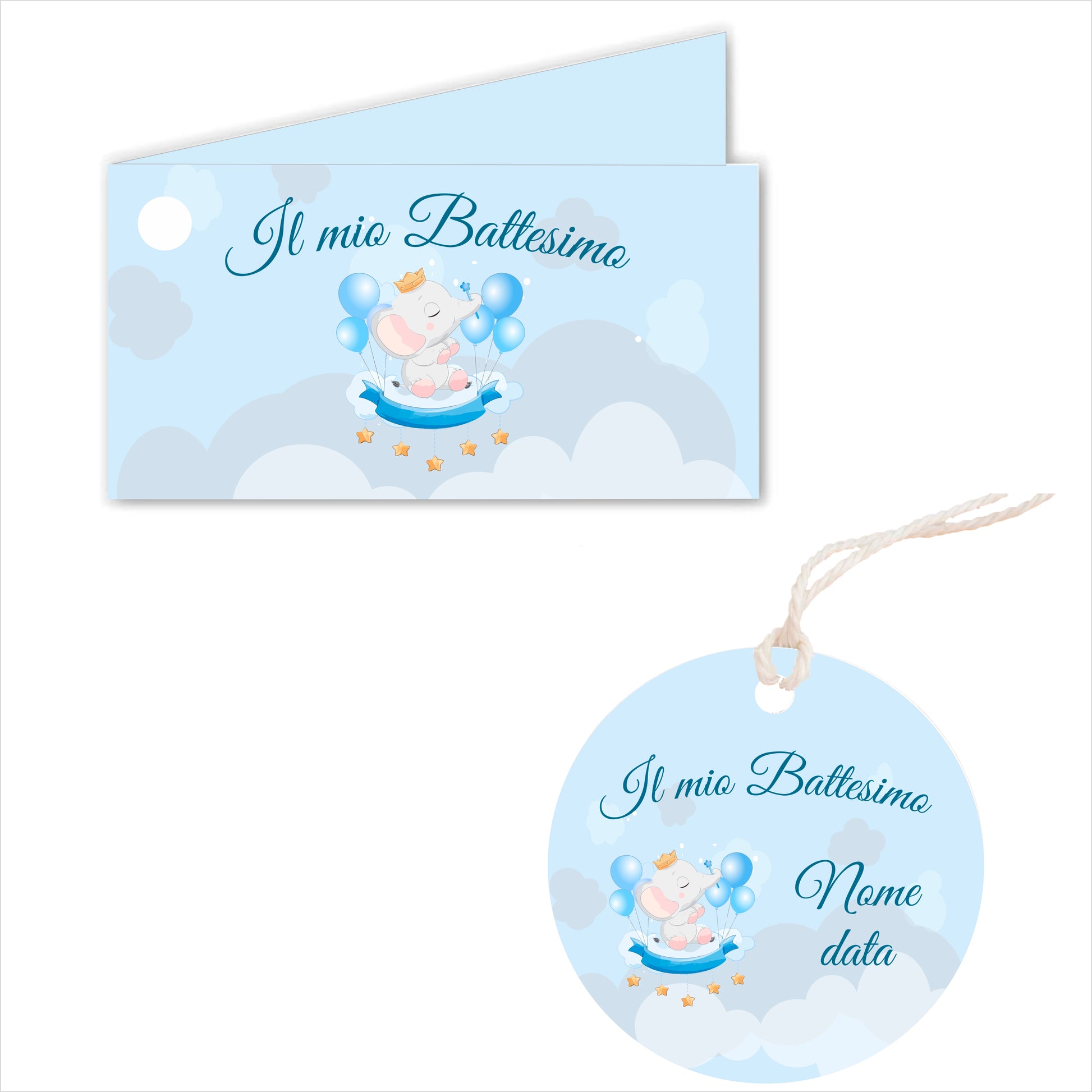 GLOBAL Bigliettini Bomboniera per Battesimo Personalizzato - ELEFANTE BIMBO - Bigliettini Bomboniera con piega, Bigliettini Bomboniera tondo, Personalizzati con Nome e Data, MADE IN ITALY