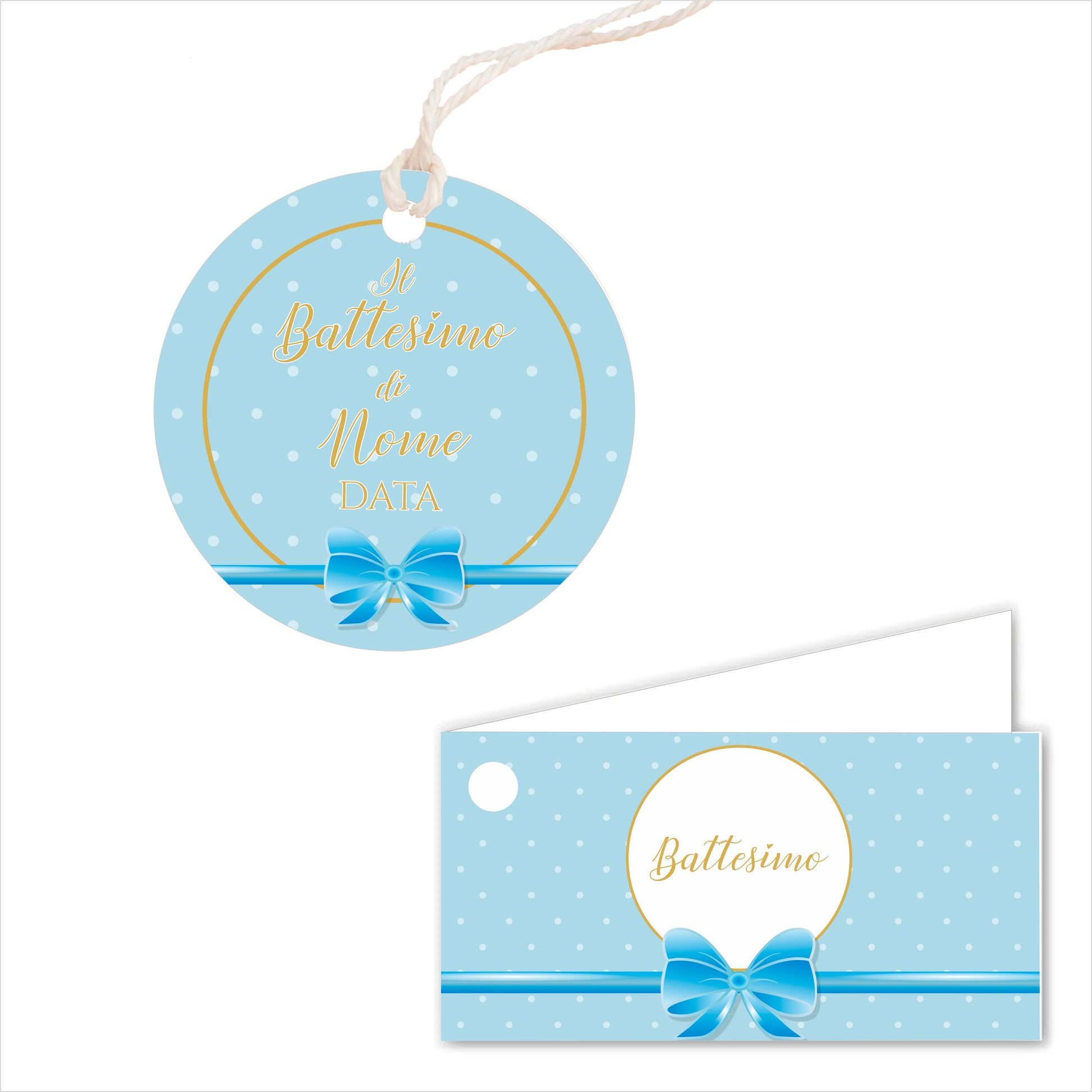 GLOBAL Bigliettini Bomboniera per Battesimo Personalizzato - FIOCCO AZZURRO - Bigliettini Bomboniera con piega, Bigliettini Bomboniera tondo, Personalizzati con Nome e Data, MADE IN ITALY