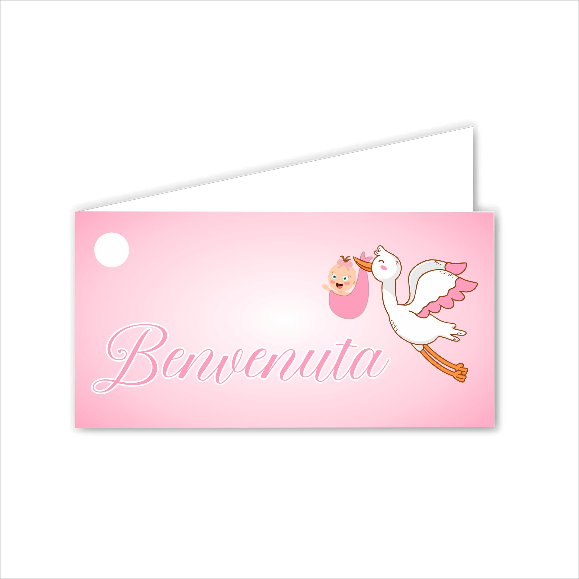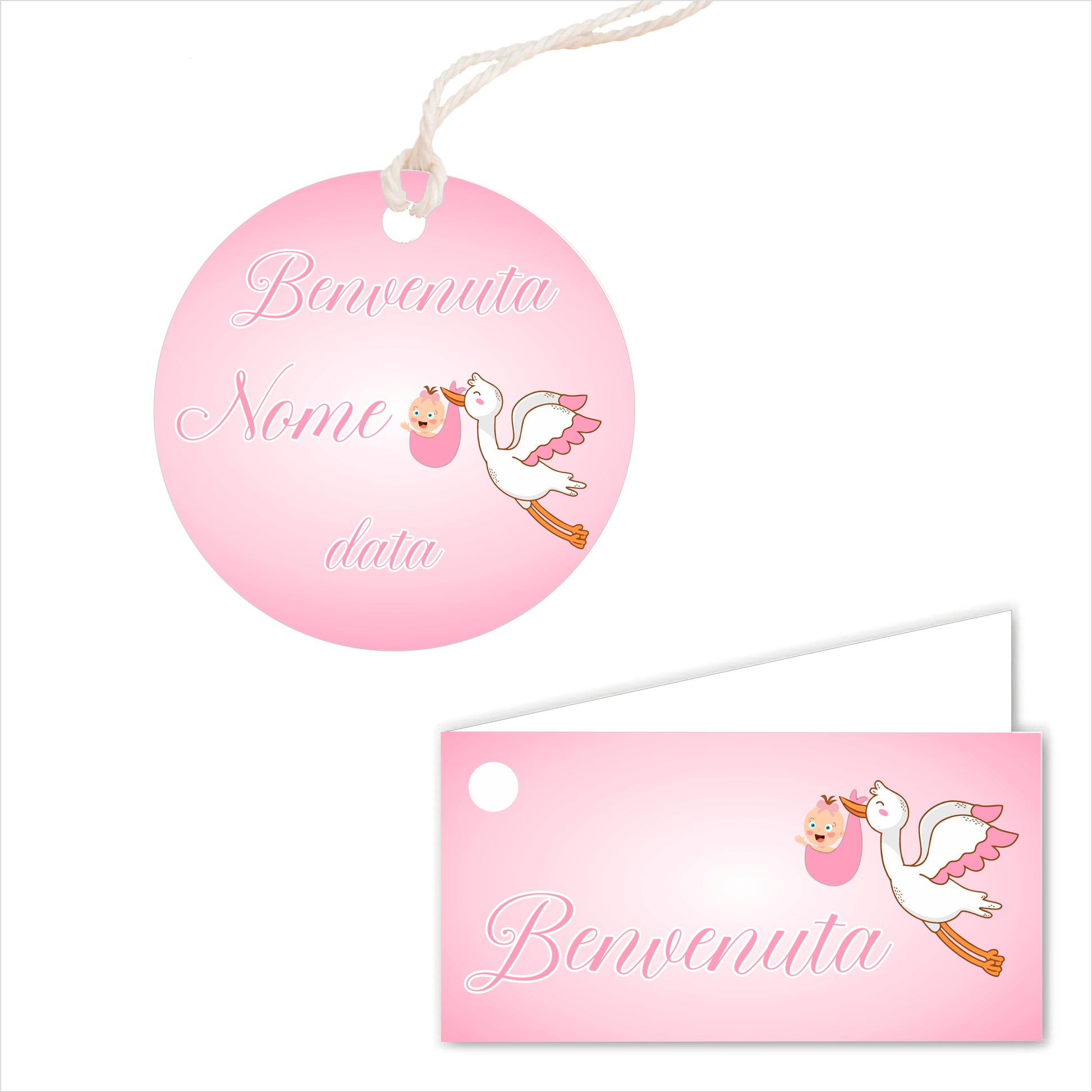 GLOBAL Bigliettini Bomboniera per Nascita Personalizzato - CICOGNA BIMBA - Bigliettini Bomboniera con piega, Bigliettini Bomboniera tondo, Personalizzati con Nome e Data, MADE IN ITALY
