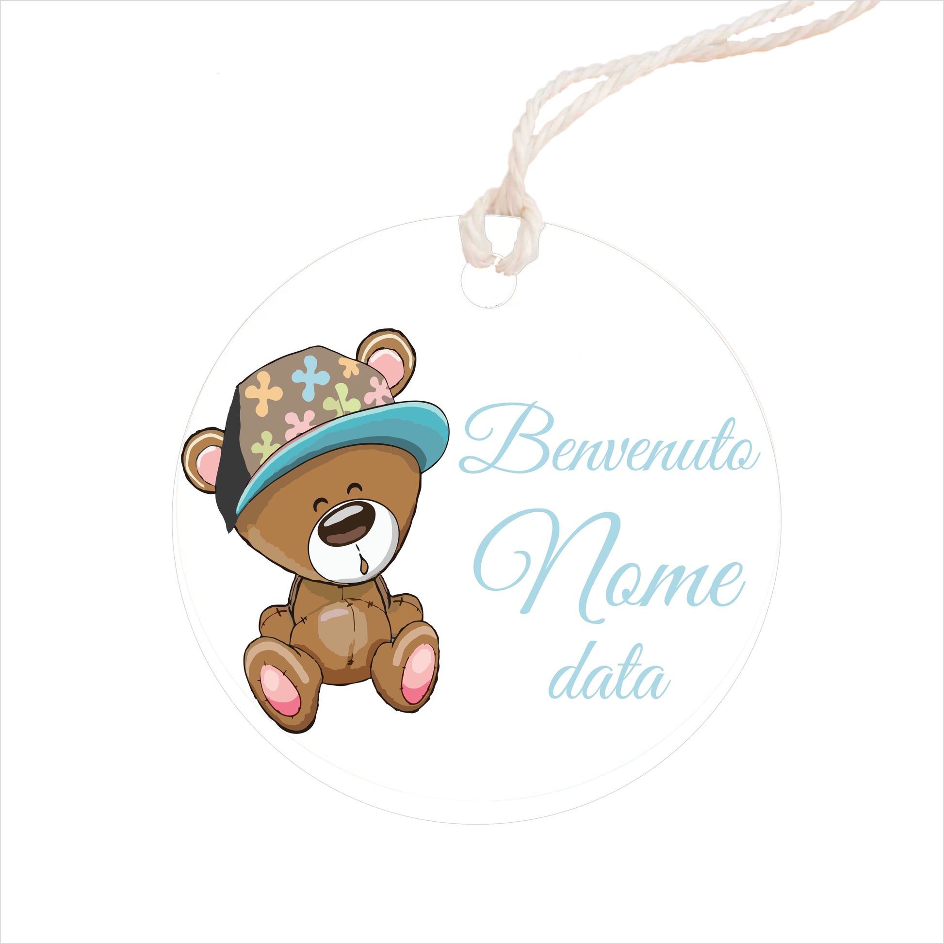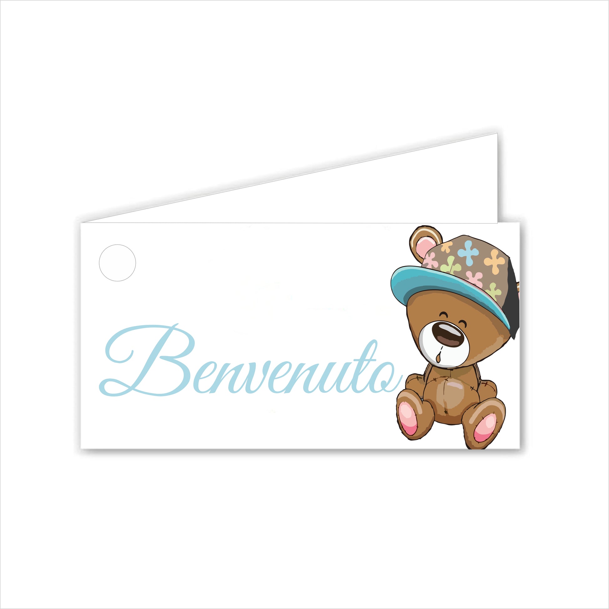 GLOBAL Bigliettini Bomboniera per Nascita Personalizzato - ORSETTO CON CAPPELLO BIMBO - Bigliettini Bomboniera con piega, Bigliettini Bomboniera tondo, Personalizzati con Nome e Data, MADE IN ITALY