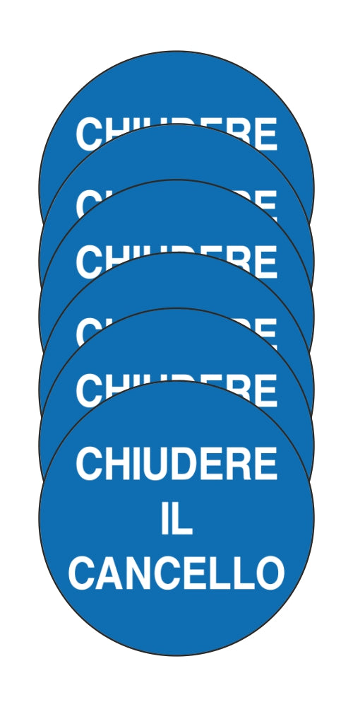 GLOBAL KIT DI 6 ADESIVI ROTONDI - CHIUDERE IL CANCELLO - Pittogramma ISO 7010 Con Stampa Diretta U.V. (IDEALE ANCHE PER ESTERNO)