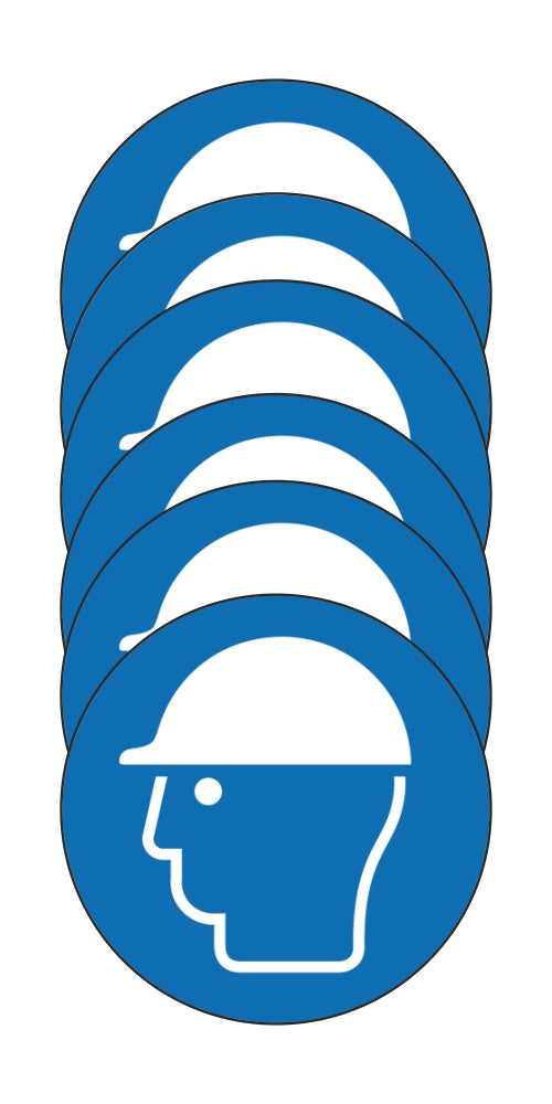GLOBAL KIT DI 6 ADESIVI ROTONDI - OBBLIGO USO ELMETTO - Pittogramma ISO 7010 Con Stampa Diretta U.V. (IDEALE ANCHE PER ESTERNO)