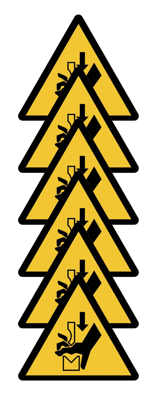 GLOBAL KIT DI 6 ADESIVI TRIANGOLARI - Pericolo schiacciamento della mano nell'ingranaggio della pressa piegatrice - Pittogramma ISO 7010 Con Stampa Diretta U.V. (IDEALE ANCHE PER ESTERNO)