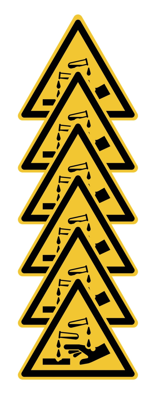 GLOBAL KIT DI 6 ADESIVI TRIANGOLARI - Pericolo Sostanze corrosive - Pittogramma ISO 7010 Con Stampa Diretta U.V. (IDEALE ANCHE PER ESTERNO)