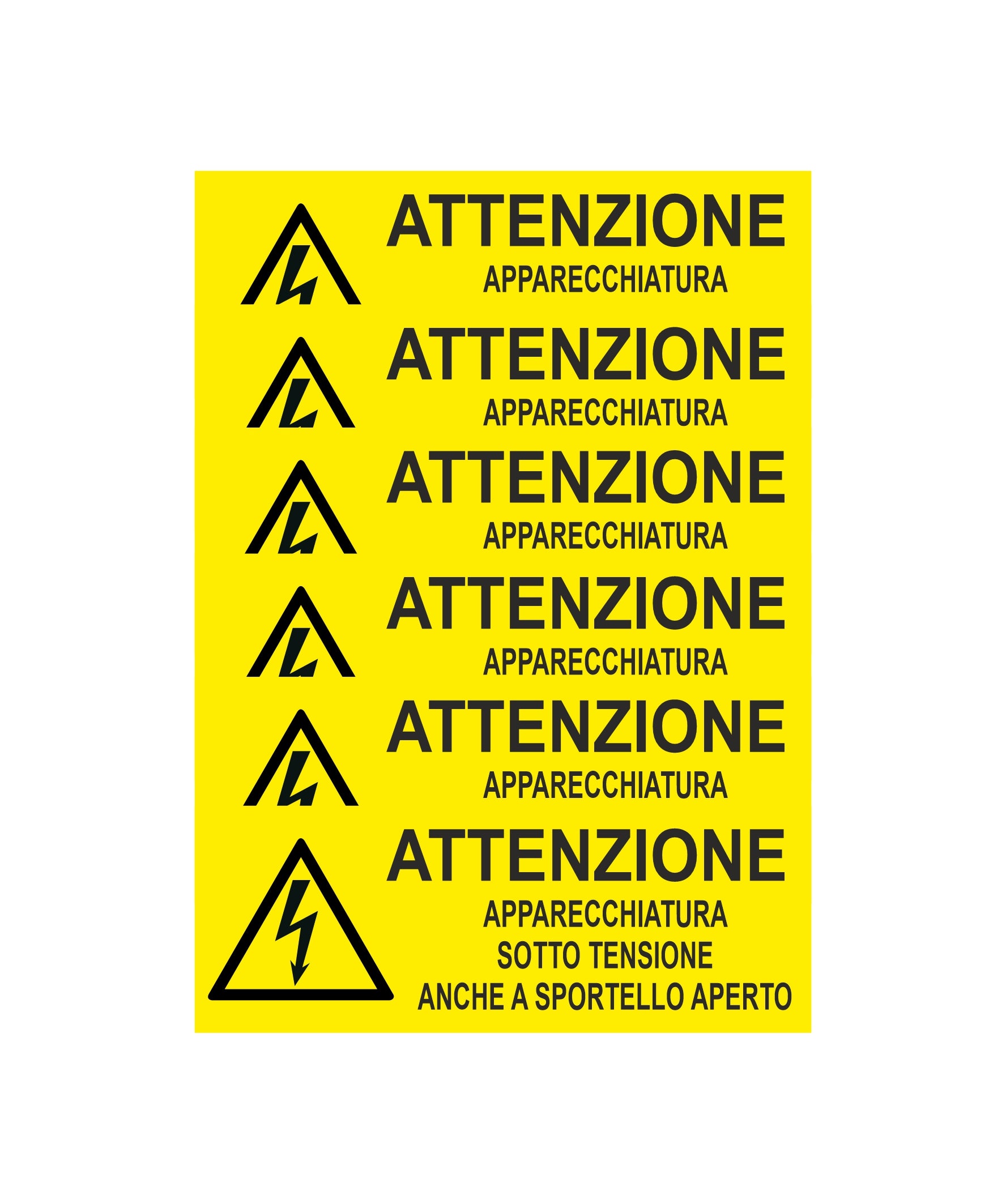 GLOBAL KIT DI 6 ADESIVI UNI - ATTENZIONE - APPARECCHIATURA SOTTO TENSIONE ANCHE A SPORTELLO APERTO - Pittogramma ISO 7010 Con Stampa Diretta U.V. (IDEALE ANCHE PER ESTERNO)