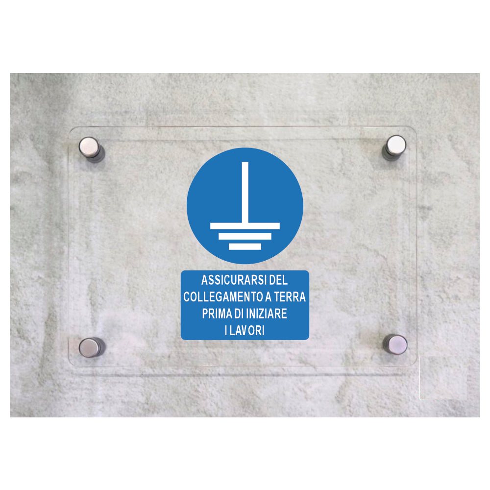 Global Targa Cartello in plexiglass - ASSICURARSI DEL COLLEGAMENTO A TERRA PRIMA DI INIZIARE I LAVORI - Con Distanziali in acciaio inox, Stampa UV.