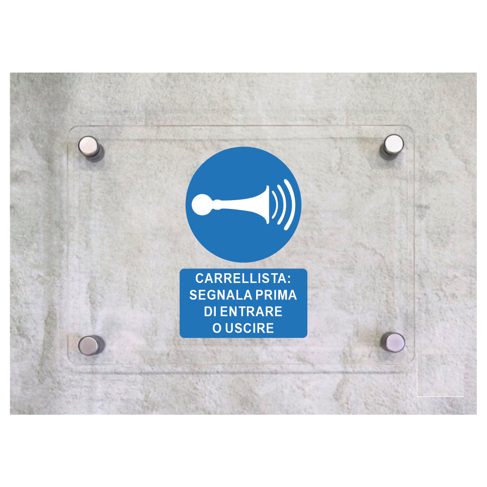 Global Targa Cartello in plexiglass - CARRELLISTA SEGNALA PRIMA DI ENTRARE O USCIRE - Con Distanziali in acciaio inox, Stampa UV.