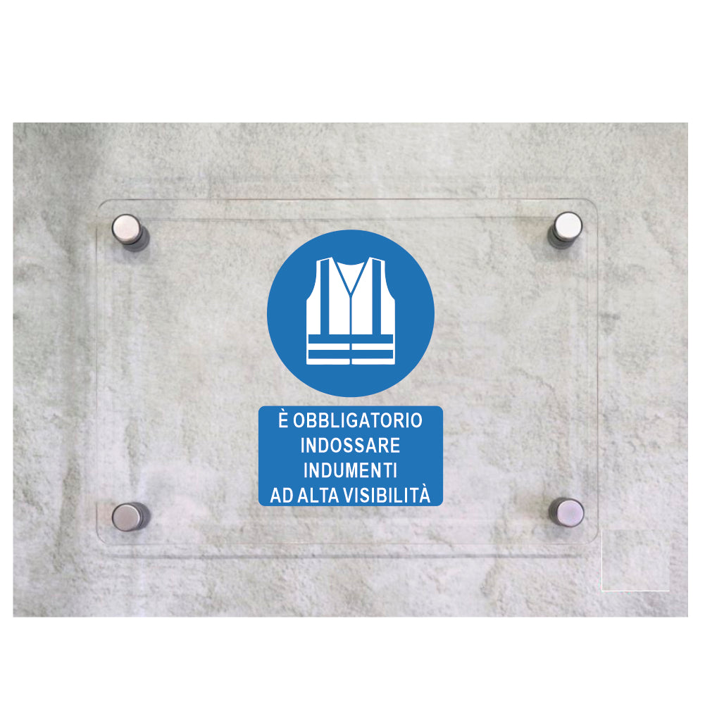 Global Targa Cartello in plexiglass - E' OBBLIGATORIO INDOSSARE INDUMENTI AD ALTA VISIBILITA' - Con Distanziali in acciaio inox, Stampa UV.