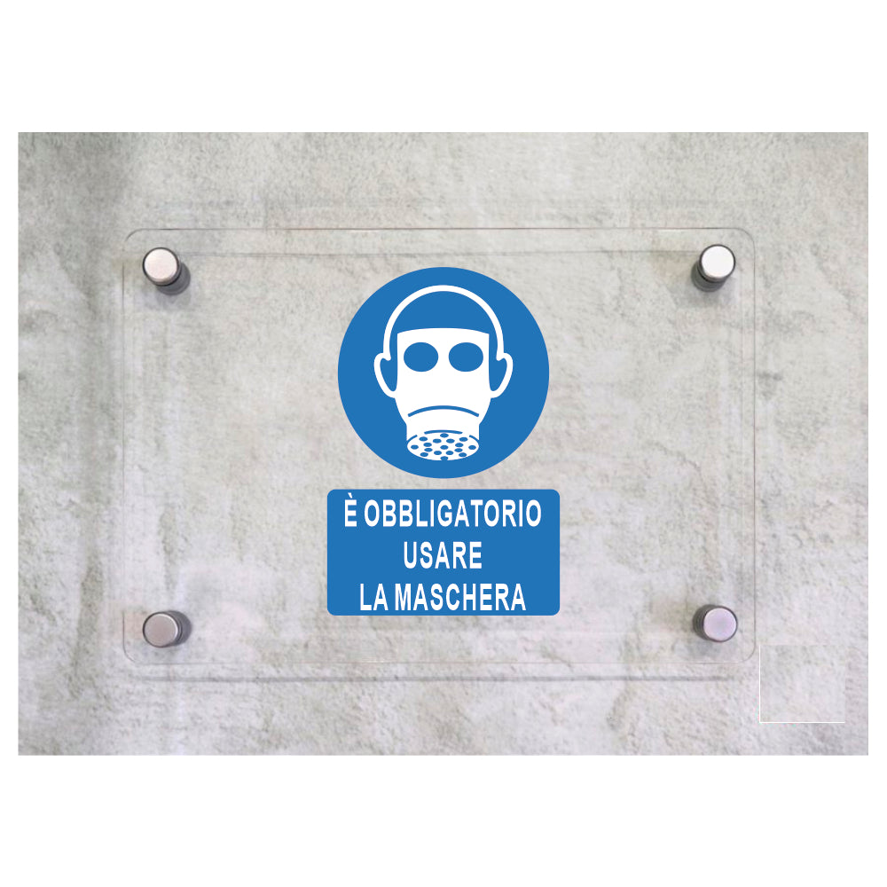Global Targa Cartello in plexiglass - E' OBBLIGATORIO USARE LA MASCHERA - Con Distanziali in acciaio inox, Stampa UV.