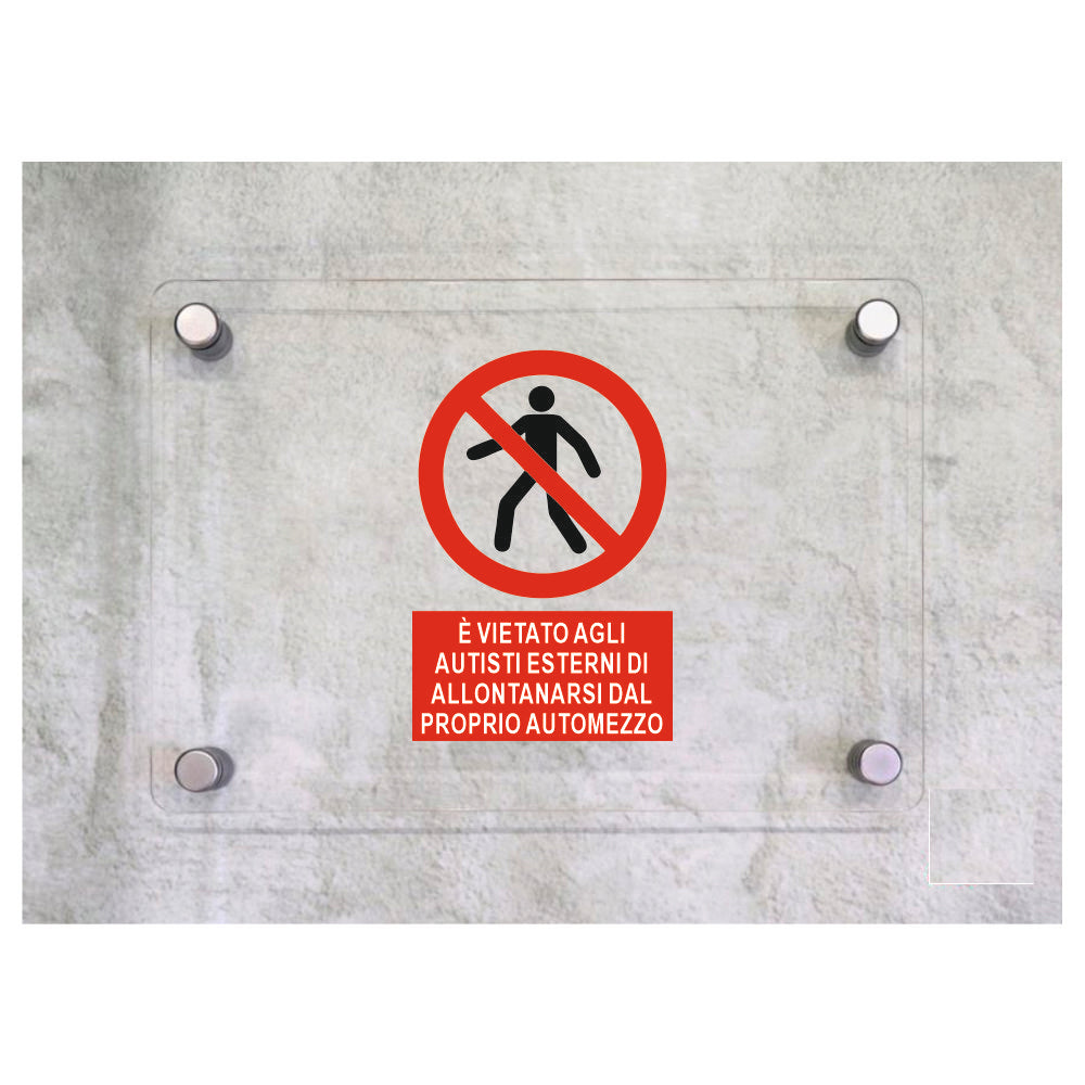 Global Targa Cartello in plexiglass - E' VIETATO AGLI AUTISTI ESTERNI DI ALLONTANARSI DAL PROPRIO AUTOMEZZO VERTICALE - Con Distanziali in acciaio inox, Stampa UV