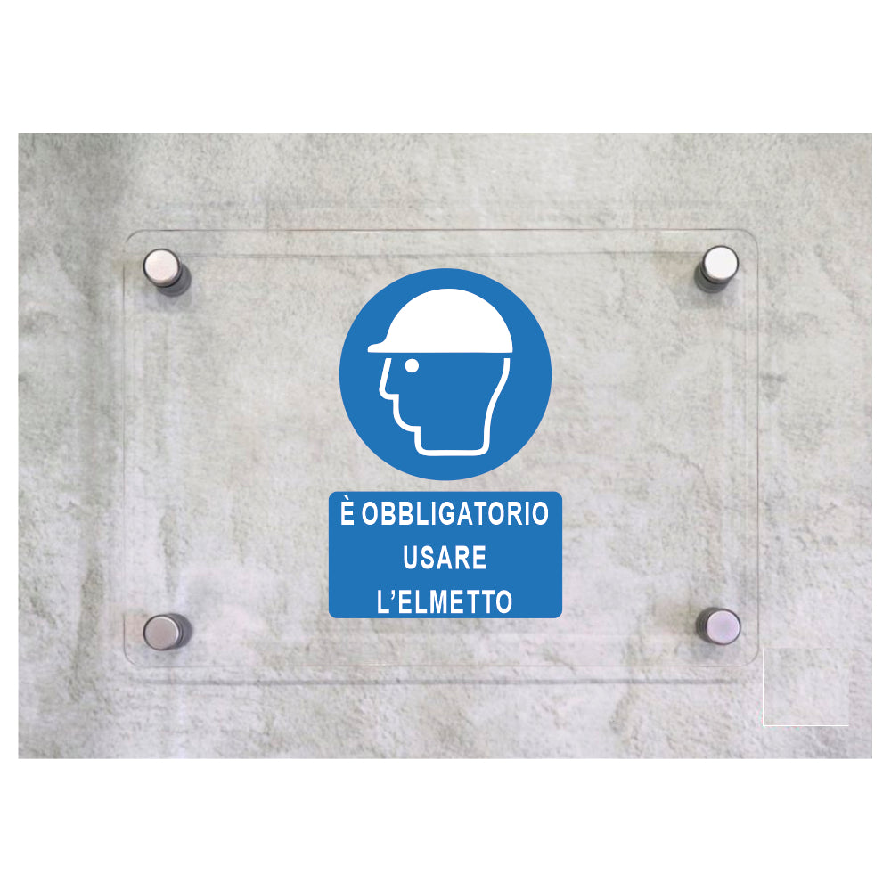 Global Targa Cartello in plexiglass - E'OBBLIGATORIO USARE L'ELMETTO - Con Distanziali in acciaio inox, Stampa UV.