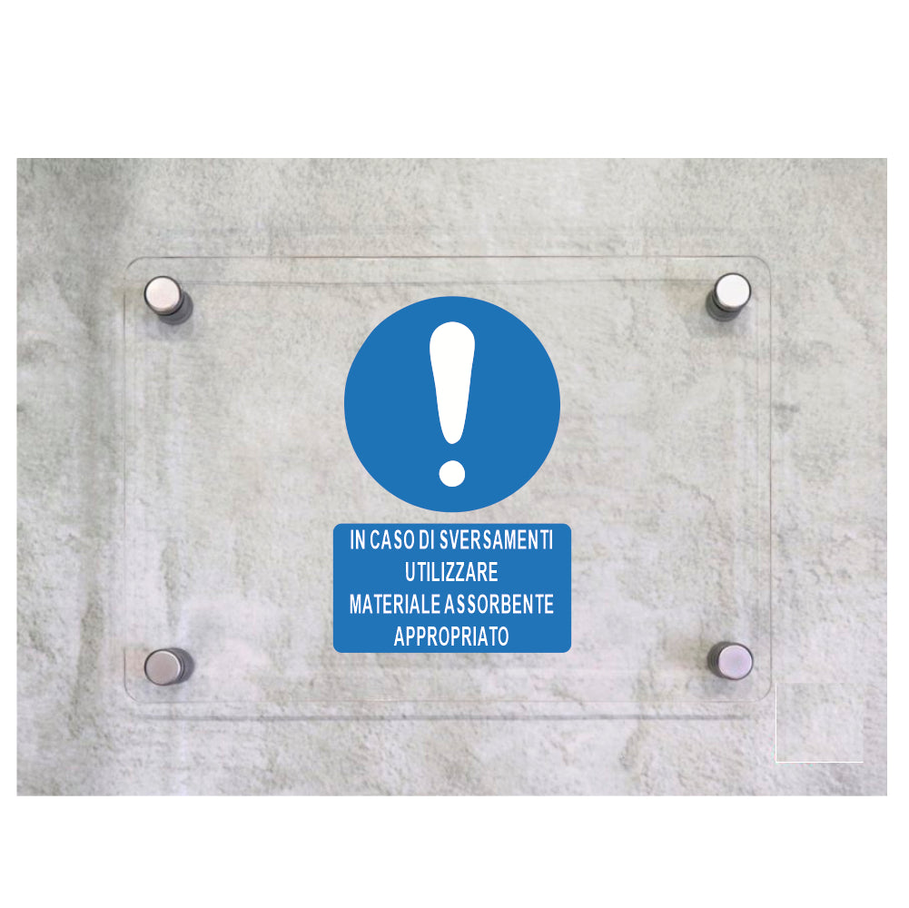 Global Targa Cartello in plexiglass - IN CASO DI SVERSAMENTI, UTILIZZARE MATERIALE ASSORBENTE - Con Distanziali in acciaio inox, Stampa UV.