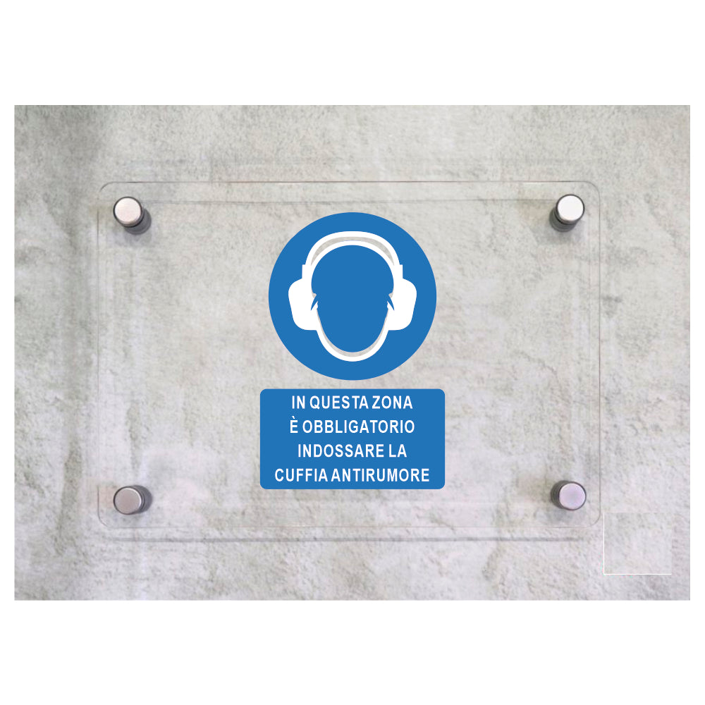 Global Targa Cartello in plexiglass - IN QUESTA ZONA E' OBBLIGATORIO INDOSSARE LA CUFFIA ANTIRUMORE - Con Distanziali in acciaio inox, Stampa UV.