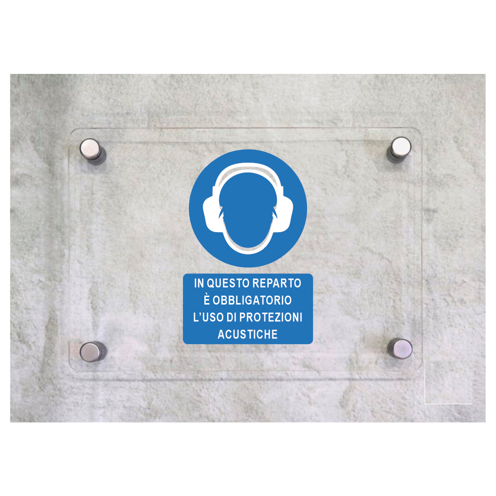 Global Targa Cartello in plexiglass - IN QUESTO REPARTO E' OBBLIGATORIO L'USO DI PROTEZIONI ACUSTICHE - Con Distanziali in acciaio inox, Stampa UV.