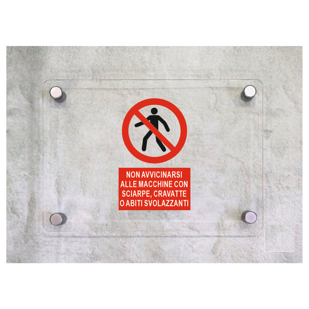 Global Targa Cartello in plexiglass - NON AVVICINARSI ALLE MACCHINE CON SCIARPE, CRAVATTE VERTICALE - Con Distanziali in acciaio inox, Stampa UV
