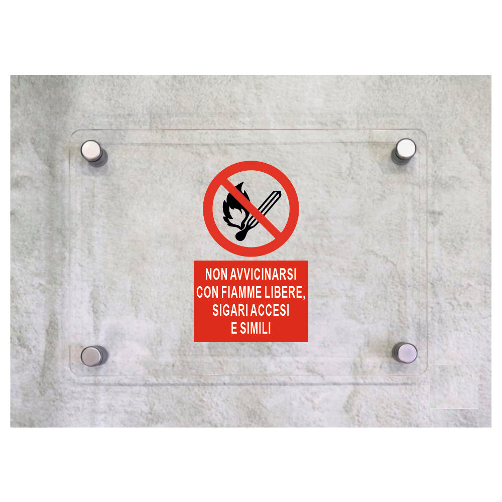 Global Targa Cartello in plexiglass - NON AVVICINARSI CON FIAMME LIBERE SIGARI ACCESI verticale - Con Distanziali in acciaio inox, Stampa UV
