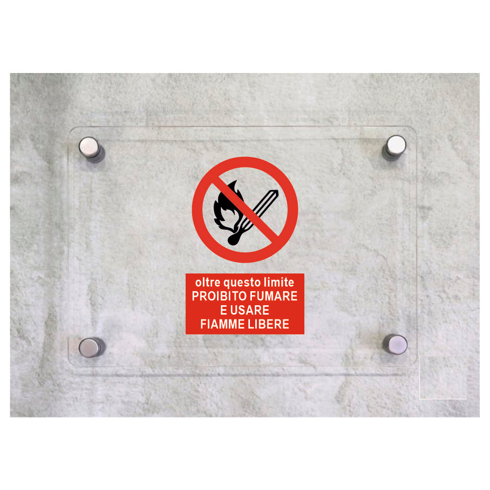 Global Targa Cartello in plexiglass - OLTRE QUESTO LIMITE PROIBITO FUMARE E USARE FIAMME LIBERE VERTICALE - Con Distanziali in acciaio inox, Stampa UV