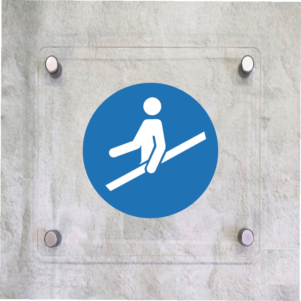 Global Targa Cartello in plexiglass Quadrato - SIMBOLO OBBLIGO TENERSI AL CORRIMANO - Con Distanziali in acciaio inox, Stampa UV
