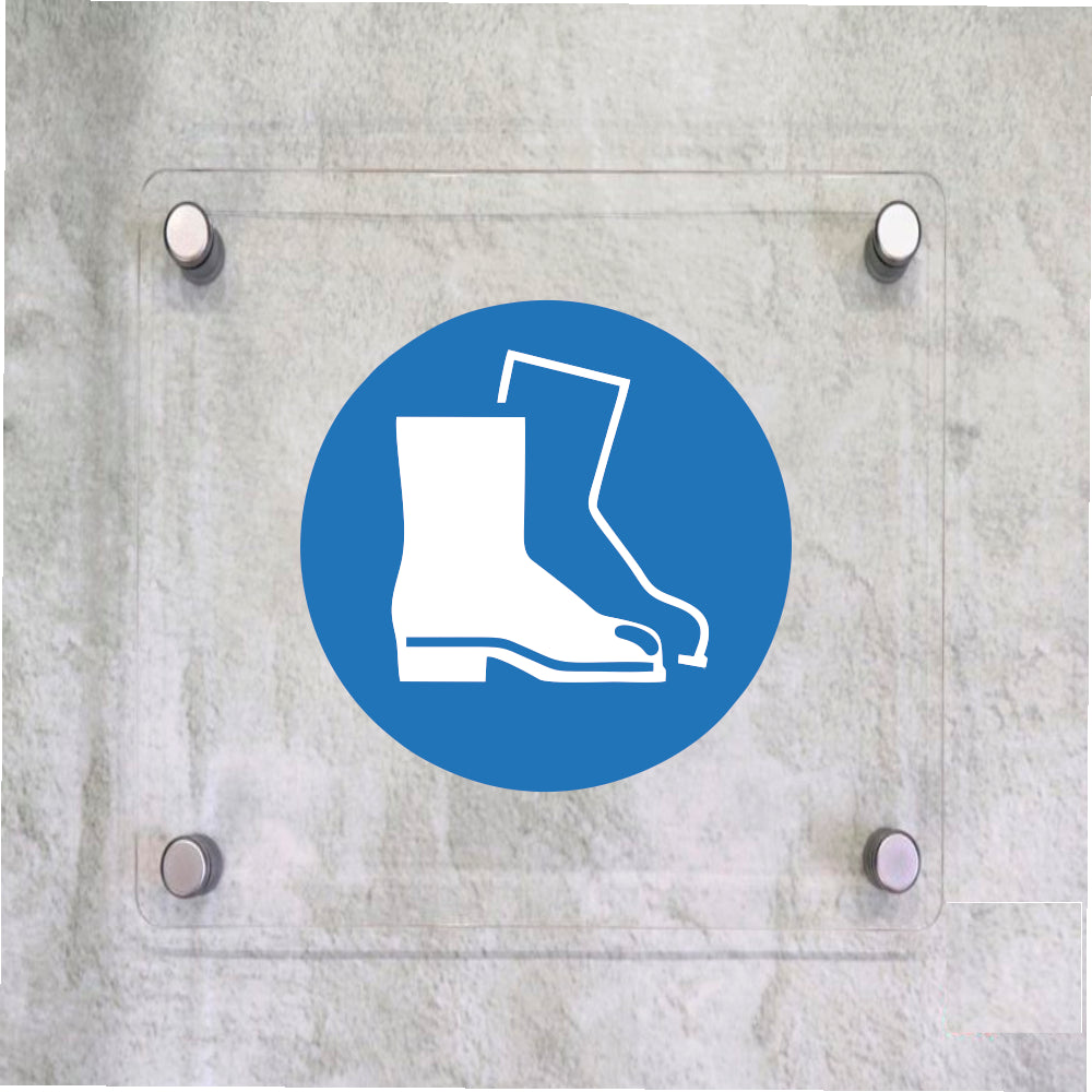 Global Targa Cartello in plexiglass Quadrato - SIMBOLO OBBLIGO USO CALZATURE DI SICUREZZA - Con Distanziali in acciaio inox, Stampa UV