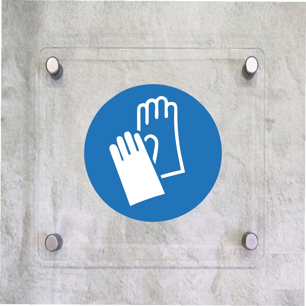 Global Targa Cartello in plexiglass Quadrato - SIMBOLO OBBLIGO USO GUANTI - Con Distanziali in acciaio inox, Stampa UV
