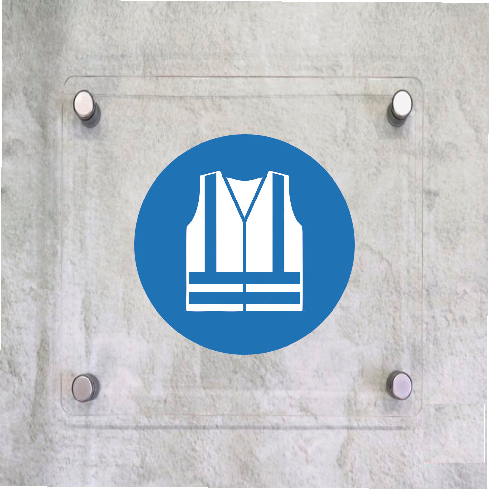 Global Targa Cartello in plexiglass Quadrato - SIMBOLO OBBLIGO USO INDUMENTI AD ALTA VISIBILITA' - Con Distanziali in acciaio inox, Stampa UV