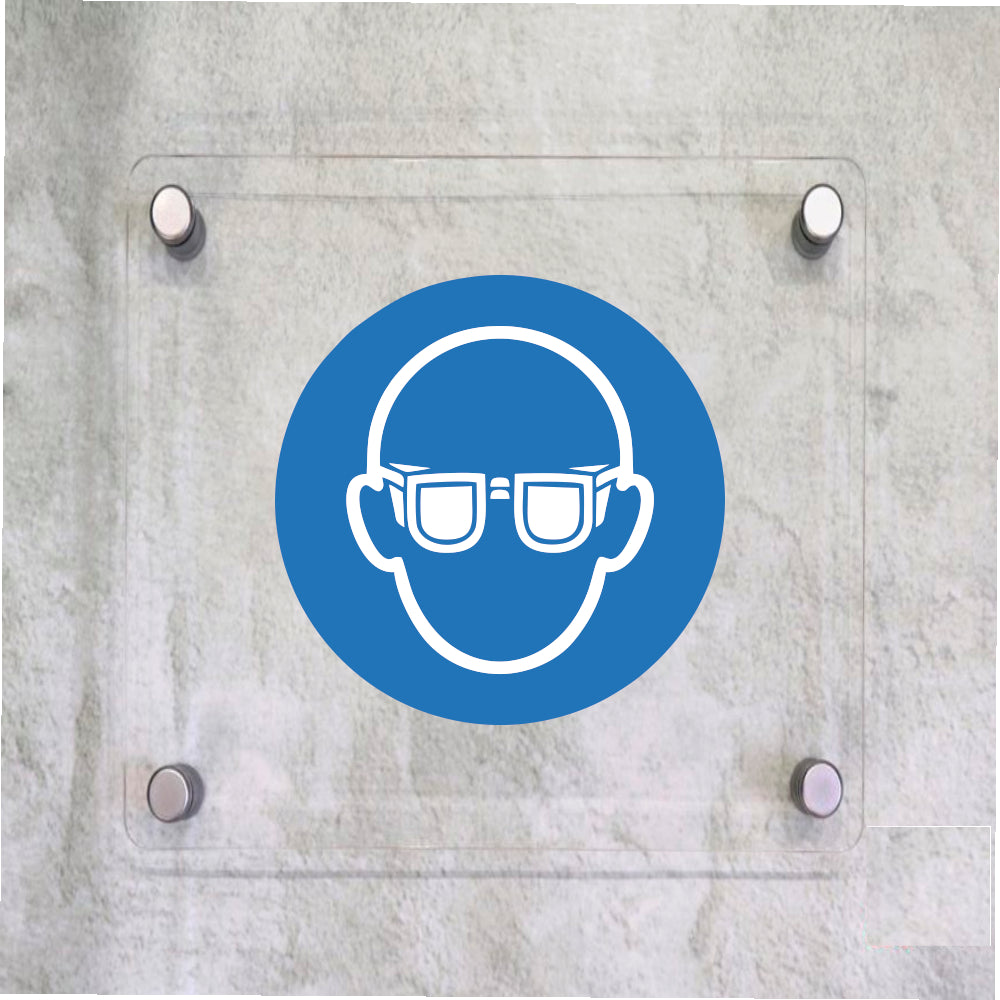 Global Targa Cartello in plexiglass Quadrato - SIMBOLO OBBLIGO USO OCCHIALI - Con Distanziali in acciaio inox, Stampa UV
