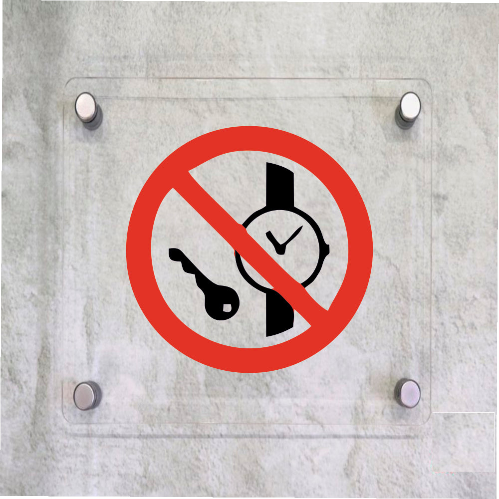 Global Targa Cartello in plexiglass Quadrato - SIMBOLO VIETATO L'ACCESSO CON OGGETTI METALLICI - Con Distanziali in acciaio inox, Stampa UV