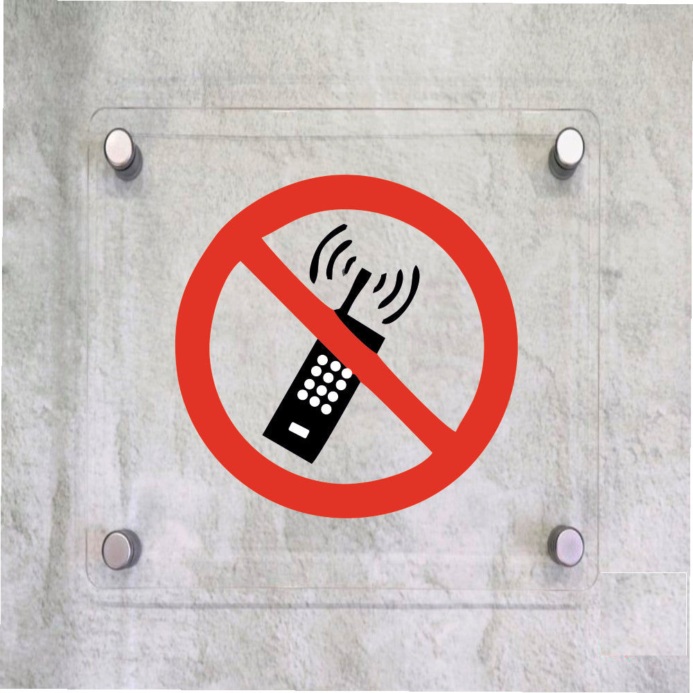 Global Targa Cartello in plexiglass Quadrato - SIMBOLO VIETATO L'USO DI TELEFONI CELLULARI - Con Distanziali in acciaio inox, Stampa UV
