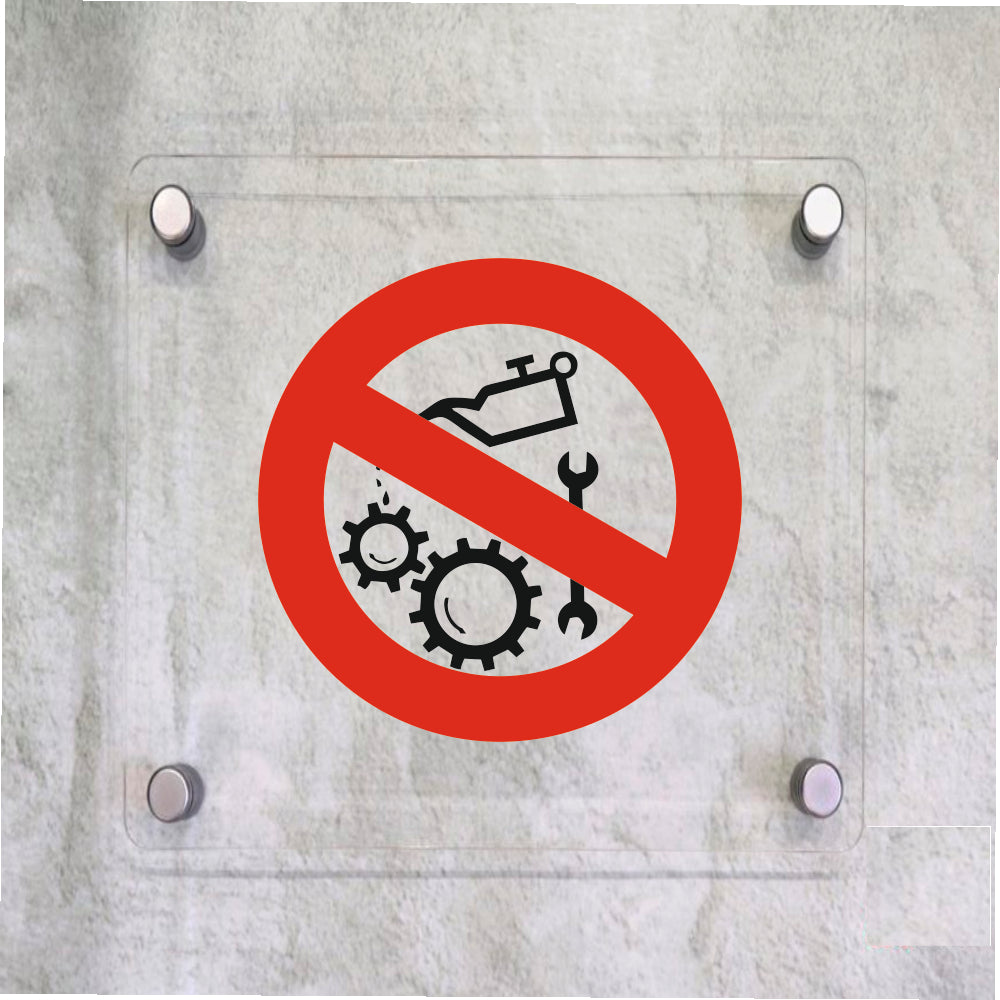 Global Targa Cartello in plexiglass Quadrato - SIMBOLO VIETATO RIPARARE, REGISTRARE, OLIARE CON ORGANI IN MOTO - Con Distanziali in acciaio inox, Stampa UV