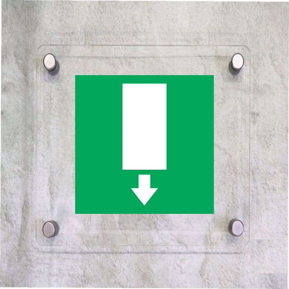 Global Targa Cartello in plexiglass Quadrato - USCITA DI EMERGENZA VERSO IL BASSO - Con Distanziali in acciaio inox, Stampa UV