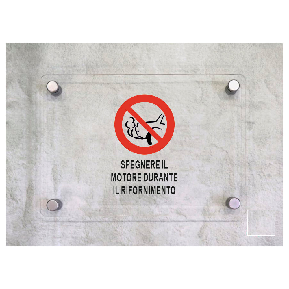 Global Targa Cartello in plexiglass - SPEGNERE IL MOTORE DURANTE IL RIFORNIMENTO - Con Distanziali in acciaio inox, Stampa UV