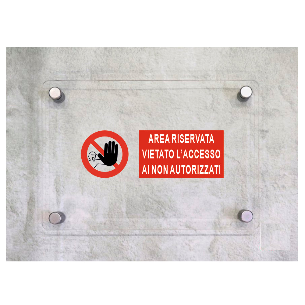 Global Targa Cartello in plexiglass UNI - AREA RISERVATA VIETATO L'ACCESSO AI NON AUTORIZZATI ORIZZONTALE - Con Distanziali in acciaio inox, Stampa UV