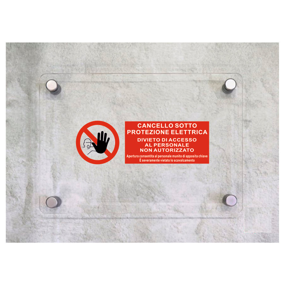 Global Targa Cartello in plexiglass UNI - CANCELLO SOTTO PROTEZIONE ELETTRICA - DIVIETO DI ACCESSO - Con Distanziali in acciaio inox, Stampa UV