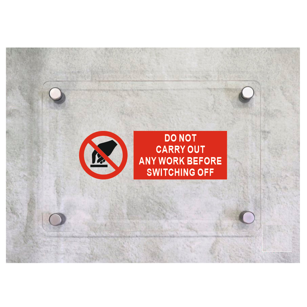 Global Targa Cartello in plexiglass UNI - DO NOT CARRY OUT ANY WORK BEFORE SWITCHING OFF ORIZZONTALE - Con Distanziali in acciaio inox, Stampa UV