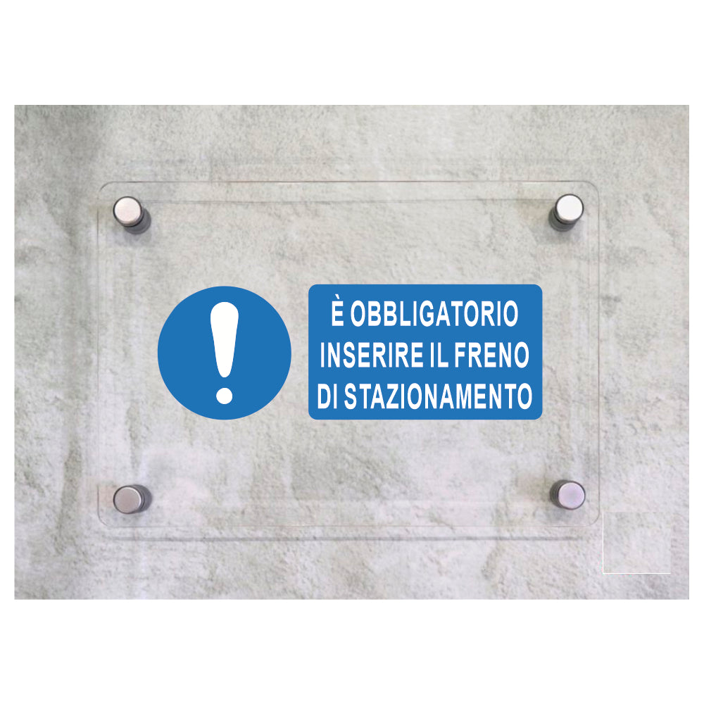 Global Targa Cartello in plexiglass UNI - E' OBBLIGATORIO INSERIRE IL FRENO DI STAZIONAMENTO - Con Distanziali in acciaio inox, Stampa UV