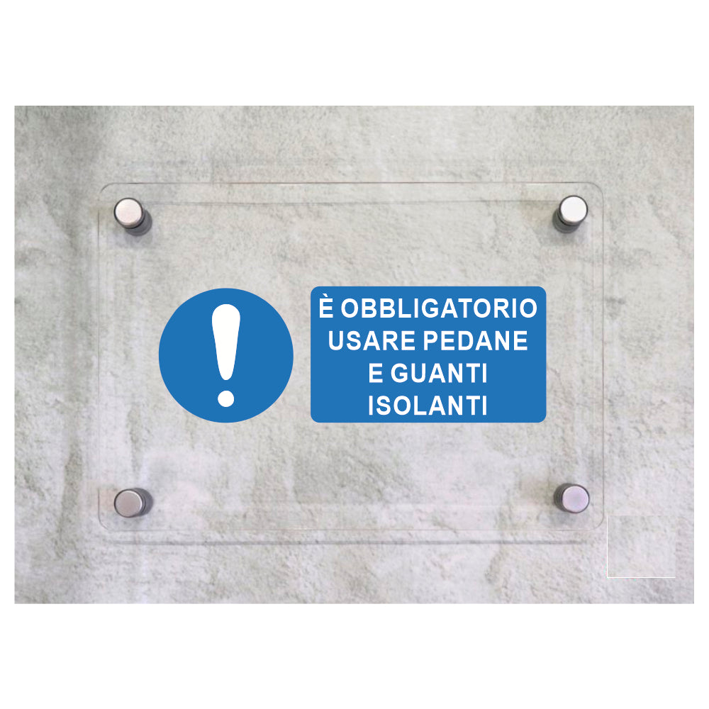 Global Targa Cartello in plexiglass UNI - E' OBBLIGATORIO USARE PEDANE E GUANTI ISOLANTI - Con Distanziali in acciaio inox, Stampa UV