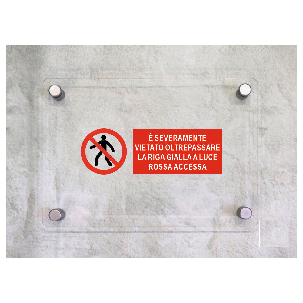 Global Targa Cartello in plexiglass UNI - E' SEVERAMENTE VIETATO OLTREPASSARE LA RIGA GIALLA... - Con Distanziali in acciaio inox, Stampa UV