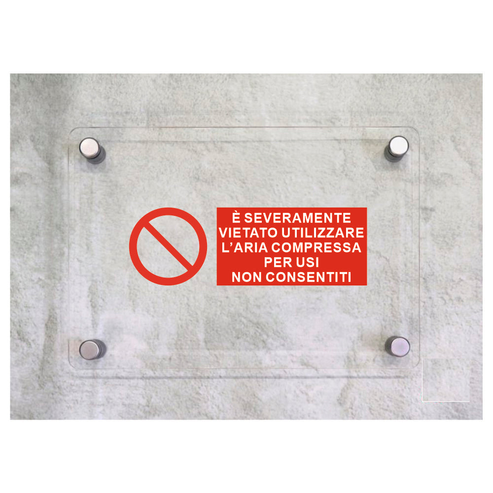 Global Targa Cartello in plexiglass UNI - E' SEVERAMENTE VIETATO UTILIZZARE L'ARIA COMPRESSA PER USI NON CONSENTITI - Con Distanziali in acciaio inox, Stampa UV