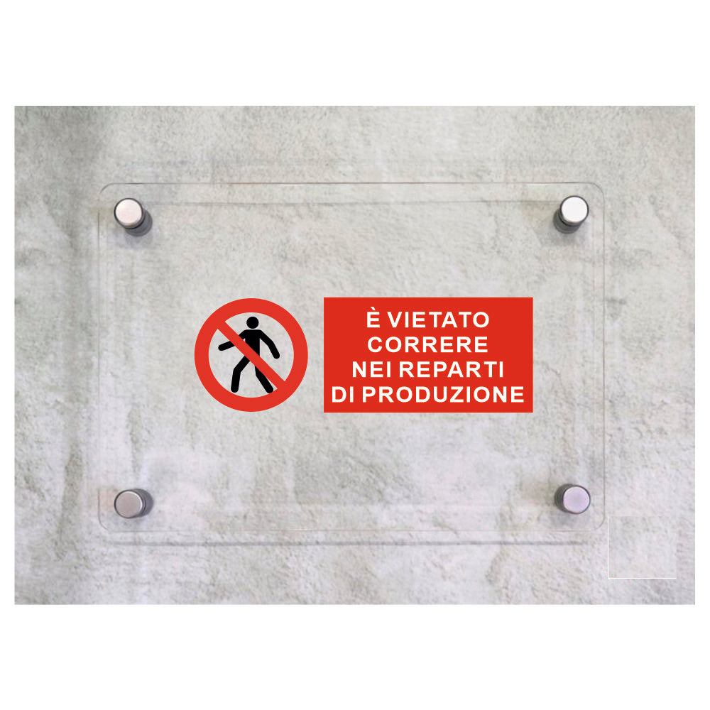 Global Targa Cartello in plexiglass UNI - E' VIETATO CORRERE NEI REPARTI DI PRODUZIONE ORIZZONTALE - Con Distanziali in acciaio inox, Stampa UV