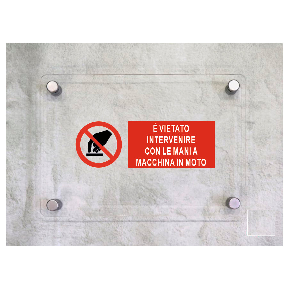 Global Targa Cartello in plexiglass UNI - E' VIETATO INTERVENIRE CON LE MANI A MACCHINA ORIZZONTALE - Con Distanziali in acciaio inox, Stampa UV