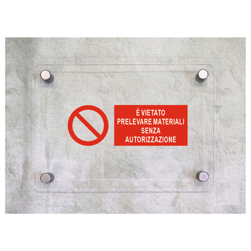 Global Targa Cartello in plexiglass UNI - E' VIETATO PRELEVARE MATERIALI SENZA AUTORIZZAZIONE ORIZZONTALE - Con Distanziali in acciaio inox, Stampa UV