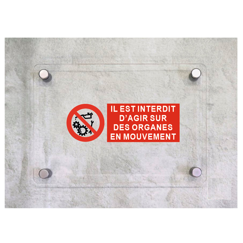 Global Targa Cartello in plexiglass UNI - IL EST INTERDIT D'AGIR SUR DES ORGANES EN MOUVEMENT ORIZZONTALE - Con Distanziali in acciaio inox, Stampa UV