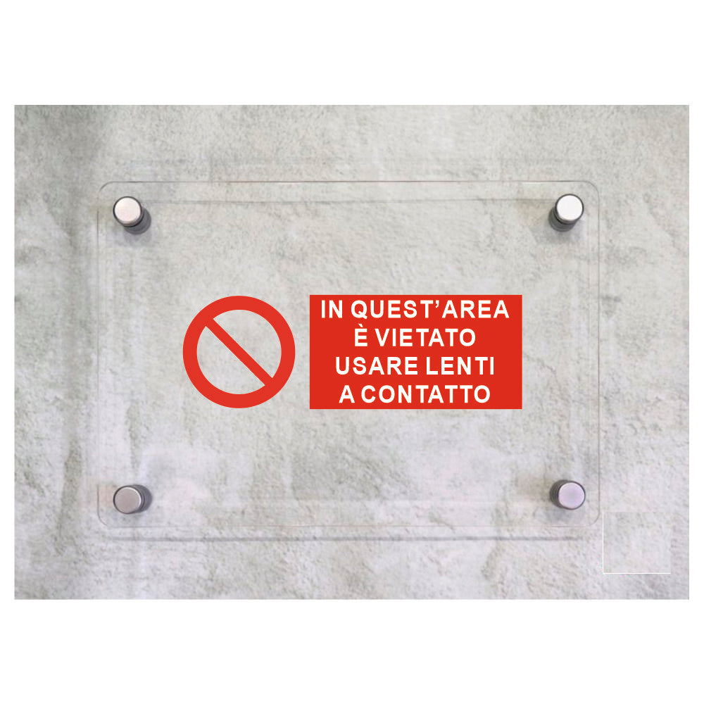 Global Targa Cartello in plexiglass UNI - IN QUESTA AREA E' VIETATO USARE LENTI A CONTATTO - Con Distanziali in acciaio inox, Stampa UV