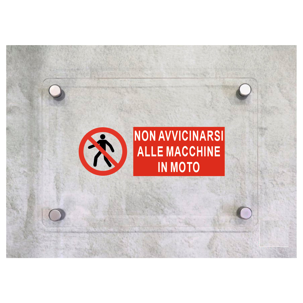 Global Targa Cartello in plexiglass UNI - NON AVVICINARSI ALLA MACCHINA IN MOTO ORIZZONTALE - Con Distanziali in acciaio inox, Stampa UV